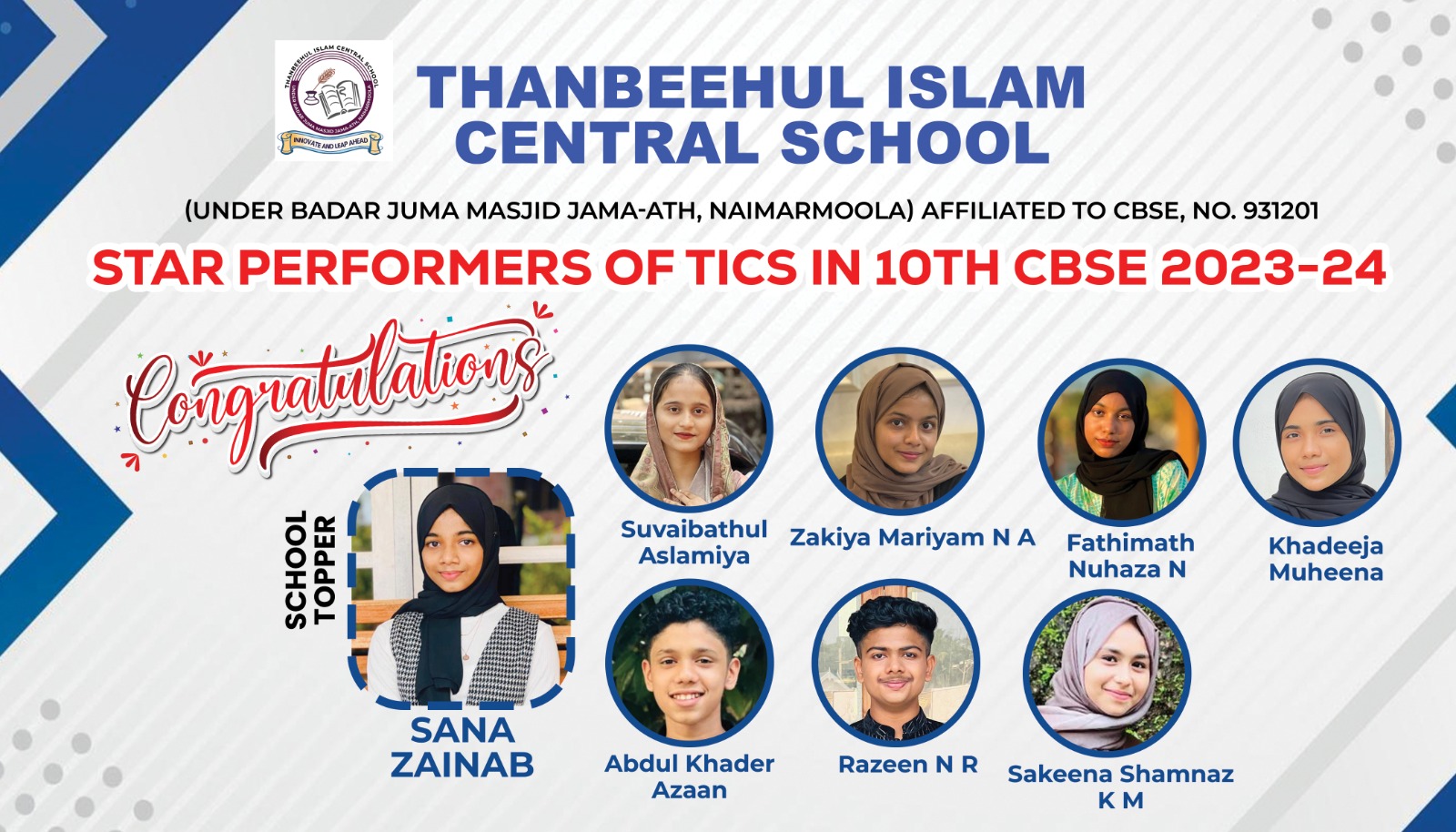 Thanbeehul Islam Central School is Aiming at imparting knowledge for a brighter tomorrow, TICS began functioning under the able management of Badar juma masjid,Naimarmoola since the year 2006. .the school is affiliated to CBSE(Affliation no:931201) and has ,over the years opened up new vistas and avenues of progress to themselves. It is a matter of great pride that TICS has been able to produce students who have transcended the parameters of excellence in both curricular and extracurricular Activities